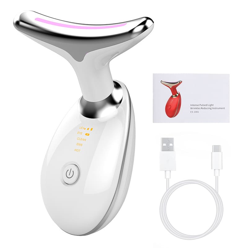 Leve, portátil e completo para cuidar da sua pele em casa! O Massageador Anti Rugas Facial Pescoço Rosto Reduzir Queixo combina massagem vibratória, microcorrente, calor suave e terapia com luz LED para estimular o colágeno, fortalecer as rugas e deixar a pele mais firme e radiante.